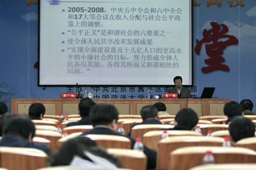作为一名社会学的知名学者和专家,李强教授从我国贫富差距的现状、当前我国社会分化的几个特点、我国贫富差别和社会矛盾的理论解释等十个方面对“贫富差距与社会公平”进行了全面深刻的阐述。李教授通过理论、实务、国内、国际等全方位的背景材料介绍了我国关于公平问题的历史演变,同时对我们党和国家关于公平、发展以及若干最新情况作了精辟的解读,令学员们受益匪浅。李教授告诉大家,研究、思考公平问题要在发展的过程中思考,包括对公平本身的理念、内涵、内容,同样要在发展的过程中思考,最终实现社会公平也是为了更好地发展。社会公平与贫富差距问题的解决对于构建和谐社会、实现科学发展有着重要的意义,李教授在讲座中不仅向学员们传授了方法,更为他们如何探索方法提供了有益的启示。学员们通过两个小时的讲座,尽情领略了李教授的风采,讲座在学员们热烈的掌声中圆满结束。(魏雯 供稿)