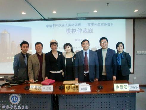 进入仲裁程序前,申请人与被申请人退场,仲裁庭内部合议:首席仲裁员张丽霞介绍案情,听取仲裁员的看法,确定需要仲裁庭解决的问题。然后申请人与被申请人入场,案件正式进入仲裁程序。仲裁程序分为提出请求、质证、辩论、裁决四个阶段。首席仲裁员张丽霞语言清晰、提问到位,亲和靓丽的风格体现出资深的执业功力。李洪积、田锐华两位仲裁员准确的点拨与评说,使学员们从亲身感受中掌握经验和技巧。申请与被申请人回答问题思路敏捷,法律适用准确。他们精彩的辩论以及着装和谈吐,受到一致好评。整个庭审过程准备充分,生趣热烈,是一次真正意义上的实践演练。