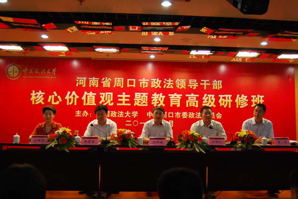 朱家臣代表周口市委政法委讲话。他说,“周口市政法领导干部核心价值观主题教育高级研修班”经过周口市委政法委、法大304永利官网登录入口的精心筹划正式开班,我代表周口市委政法委对政法大学的关心厚爱表示感谢,对前来参加培训的政法系统领导干部表示敬意。他说,在政法大学集中培训有着不同的意义。我们可以亲身感受政法大学严谨治学的校风,深厚的人文底蕴,浓郁的学习氛围,强烈的法治精神。现在对于我们干部的培训要求是素质教育、高端教育,适应社会新环境、新任务、新要求的系统教育。依托高校进行培训,是近几年提高政法干部素质的重要举措,也是提高受训层次,顺应政法干部心理需求的最佳选择。法大的领导亲自给我们授课,又聘请著名教授和领域的尖端专家授课,可以使学员受益匪浅。