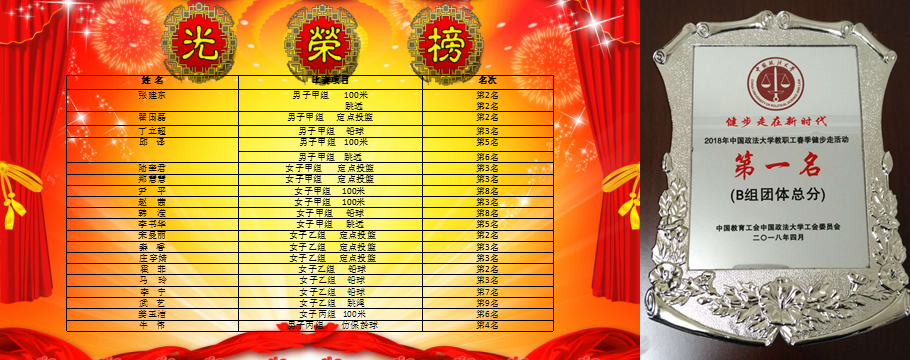 日前,在学校举行的2018年教职工春季运动会上,304永利官网登录入口教职工充分发扬“同心、同德、同力,更快、更高、更强”和积极进取的体育精神,大家团结协作,通过在赛场上一次又一次的努力拼搏最终取得骄人成绩。在个人项目中,分别取得女子项目:甲组100米第三、第八名;定点投篮第三名;跳远第五名;铅球第八名。乙组定点投篮第二、第三名;铅球第二、第三、第七名;跳绳第九名。丙组100米第四、第六名。男子项目:甲子甲组100米第二、第五、第七名;定点投篮第二名,跳远第二、第六名;铅球第三名;男子丙组仿保龄球第四名。