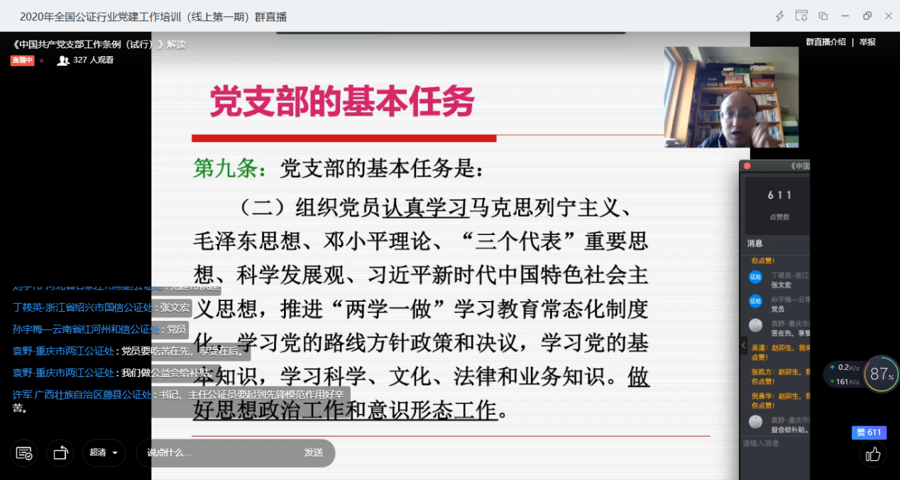 3月29日,2020年全国公证行业党建工作培训(线上第一期)以线上直播的形式正式开启。来自全国31个省、自治区、直辖市公证协会及新疆生产建设兵团公证协会选派的公证机构党组织书记(负责人),以及中国公证协会秘书处15名党员共计354人参加了直播培训。永利官网马克思主义学院赵卯生教授、吴韵曦副教授等党建专家为学员授课。