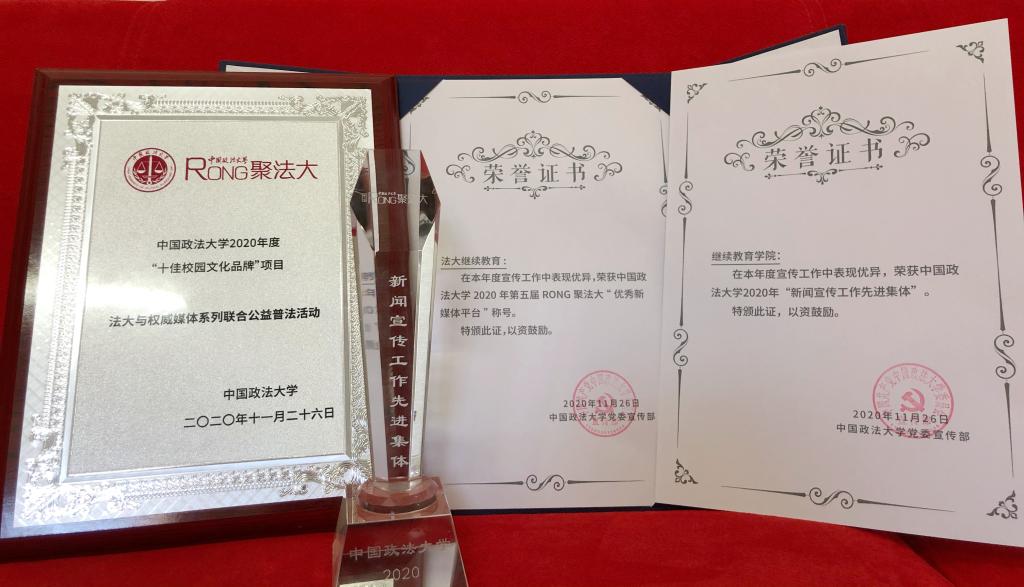 2020年11月26日,304永利官网登录入口2020年度“RONG聚法大”文化盛典颁奖仪式暨第二十二届校园广播歌手大赛于学校昌平校区礼堂举行。我院“法大与权威媒体系列联合公益普法活动”荣获“十佳校园文化品牌”,学院荣获“新闻宣传工作先进集体”称号,学院官方公众号“法大继续教育”荣获“优秀新媒体平台”称号。