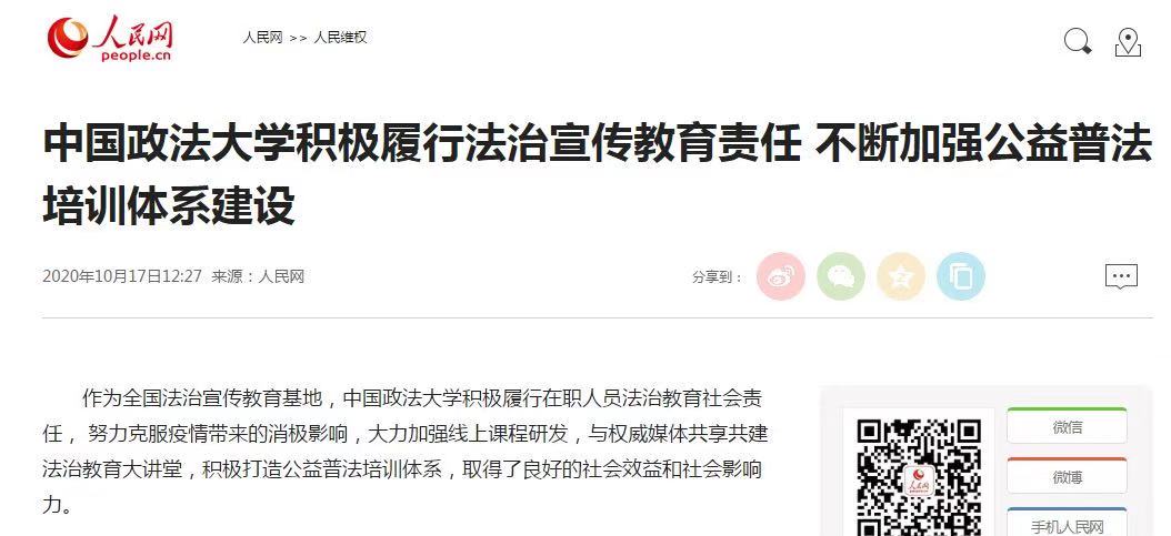 截至目前,学院已联合法制网面向社会推出在线免费法律培训学习课程;与人民网联合开通“法大在线·普法教育公益大讲堂”;联合包含“学习强国”学习平台在内的五大权威媒体出“民法典”普法宣传活动;为法考备考学子推出法律职业资格考试公益课程。系列联合公益普法活动已初步实现“全媒体上线、多渠道宣传”的良好局面,取得良好社会效益和社会影响力。“民法典”联合普法活动系列专题课程在各个平台播放总量已逾千万;学院牵头设计的专题讲座有五讲被评选为法制网“最受欢迎的十大民法典讲座”;2020中国国际远程与继续教育大会中,学院获评“2020中国最具影响力高校网络与304永利官网登录入口”,学院报送的“积极履行法治宣传教育责任,加强公益普法培训课程体系建设”项目,获评“2020中国高校远程与继续教育优秀案例”。