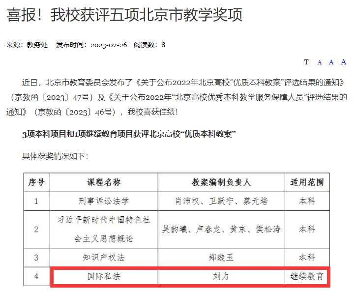 2022年11月,根据《北京市教育委员会关于开展2022年北京高校“优质本科教案”建设的通知》(京教函[2022]482号),我院申报了刘力老师的国际私法课程教案,并荣获奖项!这是高等学历继续教育首次被纳入北京高校“优质本科教案”评选活动。