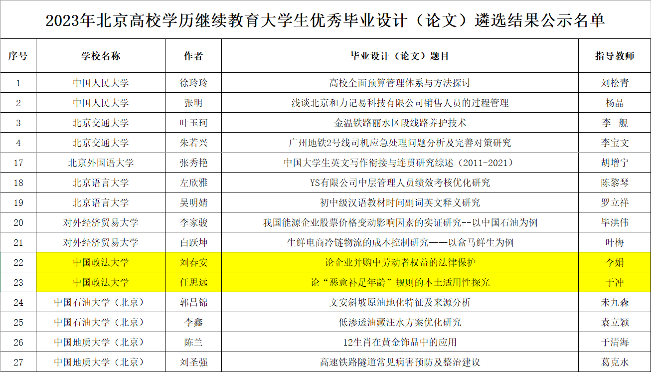 近日,北京市教育委员会公布2023年北京高校学历继续教育大学生优秀毕业设计(论文)评选结果,我院选报的两篇毕业论文均入选优秀论文名单。这两篇论文分别是:刘春安同学的《论企业并购中劳动者权益的法律保护》(民商经济法学院李娟老师指导)和任思远同学的《论“恶意补足年龄”规则的本土适用性探究》(刑事司法学院于冲老师指导)。