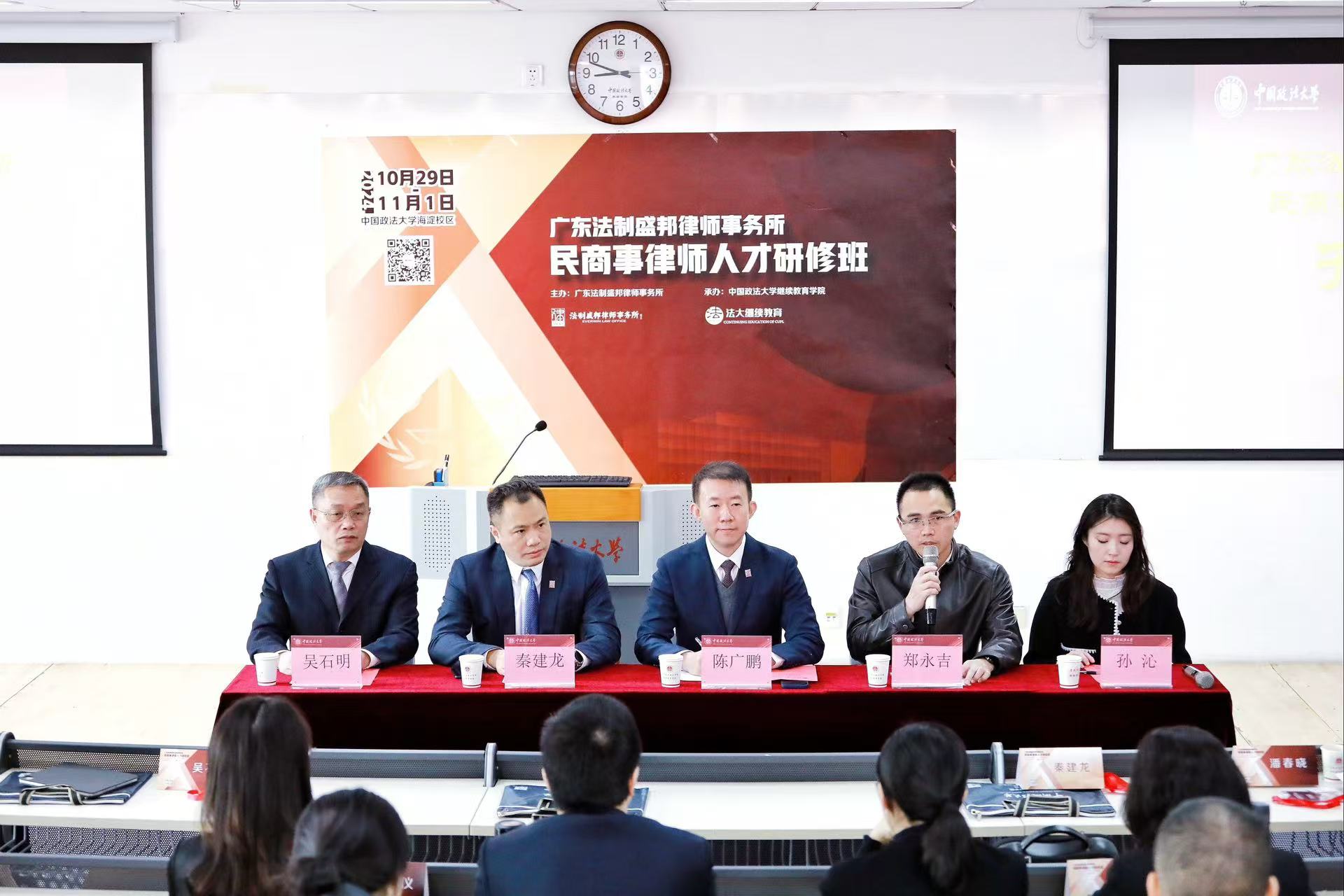 2024年10月29日,广东法制盛邦律师事务所民商事律师人才研修班在永利官网海淀校区举行。永利官网中央政法培训学院执行副院长郑永吉,广东法制盛邦律师事务所主任、党委副书记陈广鹏,广东法制盛邦律师事务所管理合伙人、公益中心主任秦建龙,广东法制盛邦律师事务所管理合伙人、党委委员吴石明参加了开班式。开班式由304永利官网登录入口律师教育培训中心主任孙沁主持。