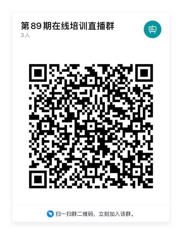 请完成缴费的学员,用钉钉扫描二维码,或钉钉搜索群号30251988查找公开群组,进入第89期在线培训直播群,遵守学习群相关规定。