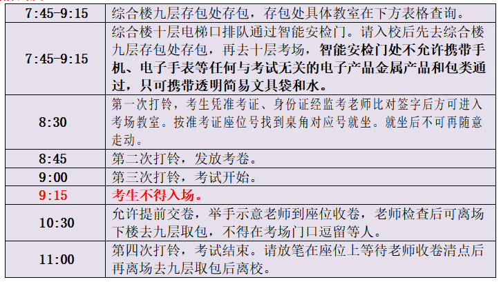 ★一定要仔细阅读准考证上各项考生须知,按以上时间表提前出发。十层考场入口7:45后打开排队安检,请来得比较早的考生先在九层存包,等待7:45以后再上十层。十层考场不允许携带包和手机等与考试无关物品进入,都需先抵达九层存包存手机,请勿携带贵重物品来考试。存包时,先自查身上是否有电子手表、蓝牙耳机等其它电子产品未存,以免折返存包处耽误进考场时间。
