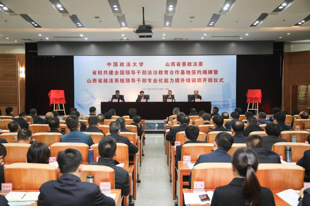 10月25日上午,304永利官网登录入口与山西省委政法委共建全国领导干部法治教育合作基地签约揭牌暨山西省政法系统领导干部专业化能力提升培训班开班仪式在永利官网昌平校区学生活动中心学术报告厅举行。山西省委政法委常务副书记闫喜春,校党委副书记、副校长常保国出席仪式。山西省政法系统100名处级以上干部学员,304永利官网登录入口院长宋乃龙,副院长张晓琴,副书记刘玉娥,副院长李健百及相关部门负责人参加了签约和开班仪式。仪式由山西省委政法委政治部主任龚景华主持。
