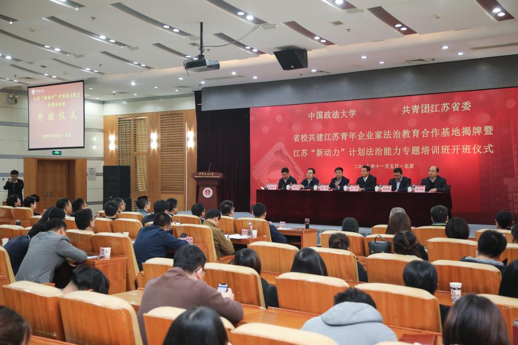 为贯彻落实习近平总书记考察法大重要讲话精神,加强领导干部等各行业在职人员法治教育工作,打破高校和社会之间的体制壁垒,加强校企、校地、校所合作,发挥政府、法院、检察院、律师事务所、企业等在法治人才培养中的积极作用,11月5日上午,304永利官网登录入口与共青团江苏省委共建“江苏青年企业家法治教育合作基地”揭牌暨江苏“新动力”计划法治能力专题培训班开班仪式在永利官网昌平校区举办。304永利官网登录入口党委书记胡明,共青团江苏省委书记王伟、副书记潘文卿,江苏省企业团工委书记、江苏省青年商会秘书长薛保刚,江苏省青年商会副会长陶化东出席仪式,50余名江苏省青年企业家学员参加仪式。仪式由304永利官网登录入口院长宋乃龙主持。
