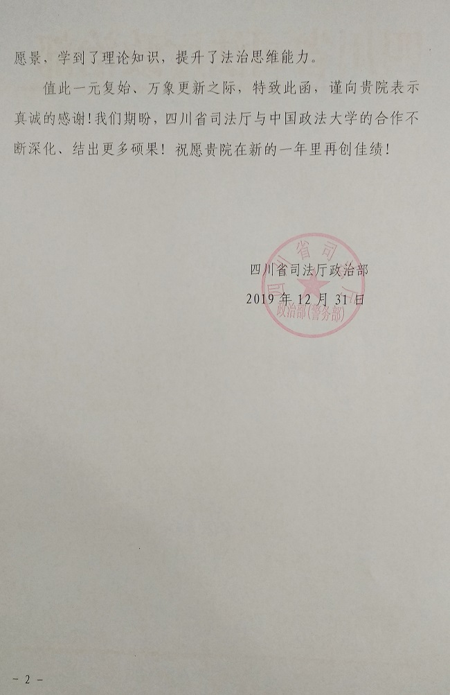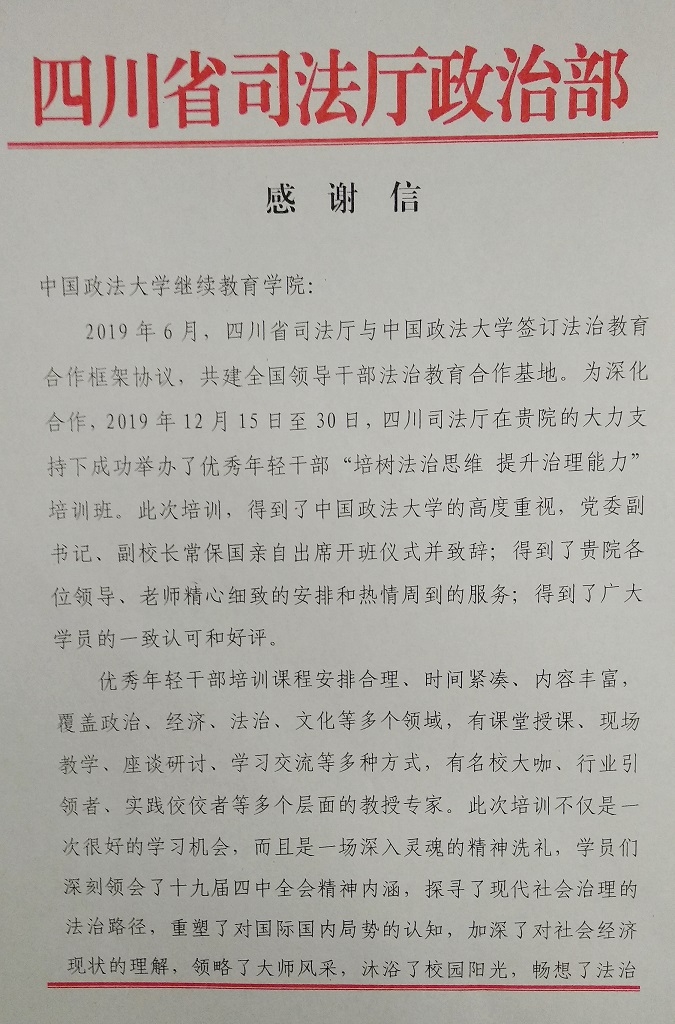 20191231日,一元复始、万象更新之际,四川省司法厅政治部致信我院,对学院在四川省优秀年轻干部“培树法治思维 提升治理能力”培训班开班期间精心、细致的安排和热情周到的服务致以衷心感谢,并对此次培训班取得的良好预期效果表示肯定。