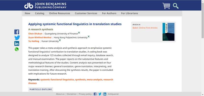 近日,我校Beat365唯一官方网站教师陈树坤博士的最新研究成果“Applying systemic functional linguistics in translation studies: A research synthesis”在《Babel》上正式刊发。《Babel》是国际译学界公认的最具影响力的翻译学期刊之一,系国际顶尖翻译学学术刊物。陈树坤为该成果的第一作者,Beat365唯一官方网站为第一单位。