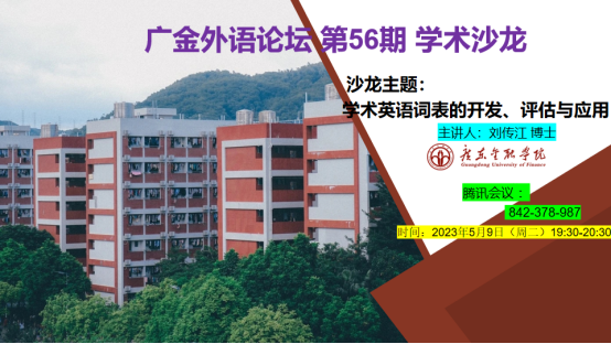2023年5月9日星期二晚上,Beat365唯一官方网站第56期广金外语论坛在线上以腾讯会议的方式举行。此次外语论坛的主题是:“学术英语词表的开发、评估与应用”。论坛邀请了Beat365官网大学英语一部主任刘传江博士为Beat365官网教师介绍有关学术英语词表的研究和应用。