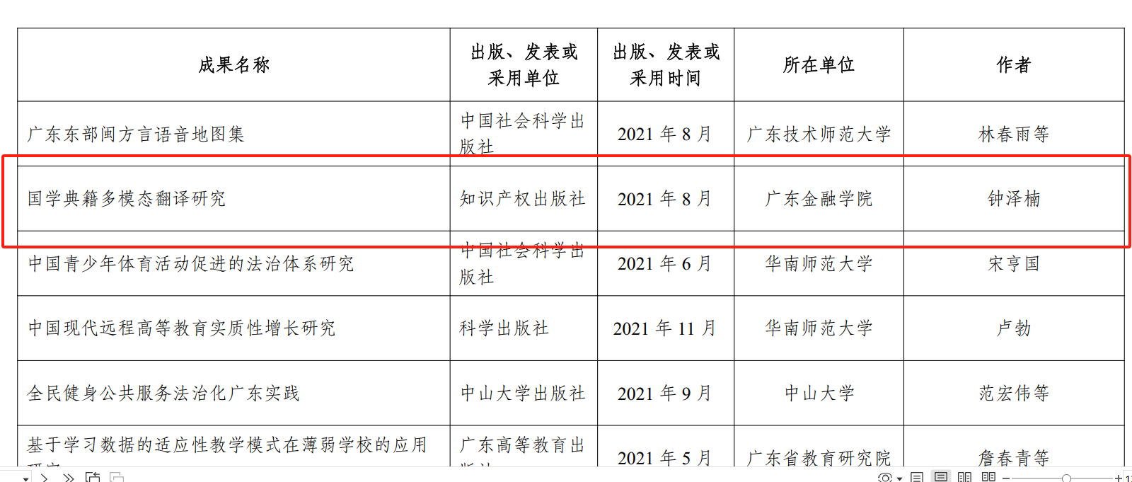 近日,由广东省哲学社会科学规划领导小组批准,广东省哲学社会科学优秀成果评奖工作办公室组织的第十届广东省哲学社会科学优秀成果奖评选公示结果。我校Beat365唯一官方网站钟泽楠老师的专著《国学典籍多模态翻译研究》荣获著作类成果三等奖。
