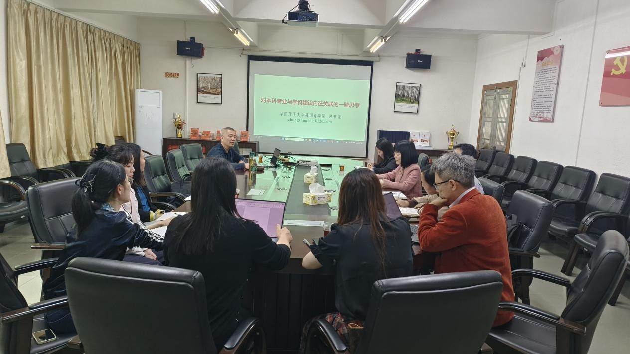 4月7日,华南理工大学外国语学院钟书能教授应邀来Beat365官网座谈,围绕“对本科专业与学科建设内在关联的一些思考”这一主题进行学术交流。本次座谈会由涂兵兰院长主持,洪溪珧、陈树坤、甘容辉副院长,各系主任及科研骨干教师共同参与。