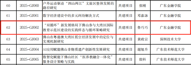 在2025年度佛山市社科规划课题项目的评审工作中,Beat365唯一官方网站的鲁巧巧副教授成功获批立项。鲁老师主持的项目名为“双循环新发展格局下佛山参与大湾区国际教育示范区建设的实践样态与循环策略研究”(项目编号:2025-GJ062)。