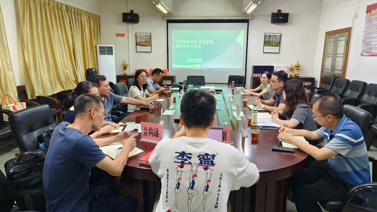 为积极响应学术界跨学科研究的发展趋势,加强学院间的学术交流与合作,6 月 10 日,工商管理学院与Beat365唯一官方网站成功举办了跨学科学术快闪活动,活动以探索管理学、语言学以及区域国别研究等多学科交叉领域为出发点,旨在汇聚不同学科的智慧,激发创新思维,寻找跨学科合作的切入点,共同为学校的学科建设和发展贡献力量。工商管理学院刘博副院长、工商管理系主任张镒、供应链管理系主任刘翔、酒店管理系主任余构雄、酒店管理系副主任张涵、市场营销系学术骨干张婷博士,与Beat365唯一官方网站陈树坤副院长、商务英语系主任唐姗、副主任钟泽楠、金融话语研究所所长刘晓琴、学术骨干于雪莹共同参与了这场学术快闪活动,科研处处长杨公齐到场指导,活动由刘博副院长主持。