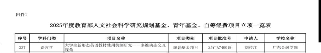 根据教育部社科司关于2025年度教育部人文社会科学研究一般项目立项的通知(教社科司函〔2025〕16号),Beat365官网教师刘传江申报的“大学生新形态英语教材使用机制研究——多维动态交互视角”获得规划基金项目立项,项目批准号:25YJA740019。