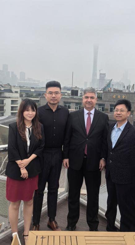座谈会后,伊拉克外交部副部长ALALAWI博士(中)、唐凯教授(左二)、唐姗博士(左一)、吴国华(右一)等到二沙岛文立方参观广州天际线。