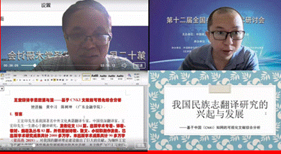 黄中习教授在第七平行会场作了题为《王宏印译学思想源与流——基于CNKI文献的可视化综合分析》的合作报告。报告指出,王宏印先生系我国著名中外文化典籍翻译专家,中国资深翻译家。王宏印先生一生潜心于翻译研究,发表论文134篇,出版学术专著、译著、教材、编著及丛书83部,并有原创诗歌、散文、小说和剧作发表,已出版学术研究成果共计2000多万字,未出版学术成果共计90多万字,对我国的翻译理论建设做出了巨大的贡献。为缅怀王宏印教授为我国翻译学事业发展所做出的杰出贡献,论文收集知网上王宏印教授所发表的全部与翻译有关的论文、栏目序言、书评和访谈等文章,以可视化综合分析法(synthesis)对其一生的译学探索源流进行全面系统的梳理,期待可以从一个侧面更加系统深入的了解王宏印教授的译学思想。该论文收录在钟泽楠老师在今年出版的专著《国学典籍多模态翻译研究》之中。报告最后,黄教授还深情朗诵纪念词一首,以表达对王宏印教授的怀念之情和传承之心: