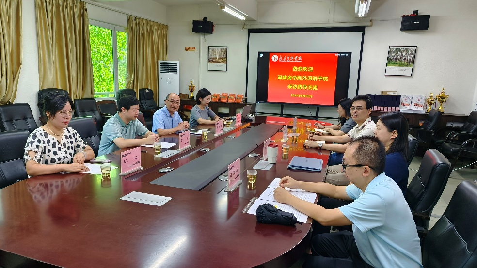 9月26日上午,福建商学院外国语学院副院长童成寿率教研室主任薛禾、教师郭桓、江虹一行四人莅临Beat365唯一官方网站,就外语类专业建设与人才培养开展深度交流。Beat365官网副院长陈树坤、副书记王丹、英语系主任毕亚男、商务英语系副主任钟泽楠出席座谈会。