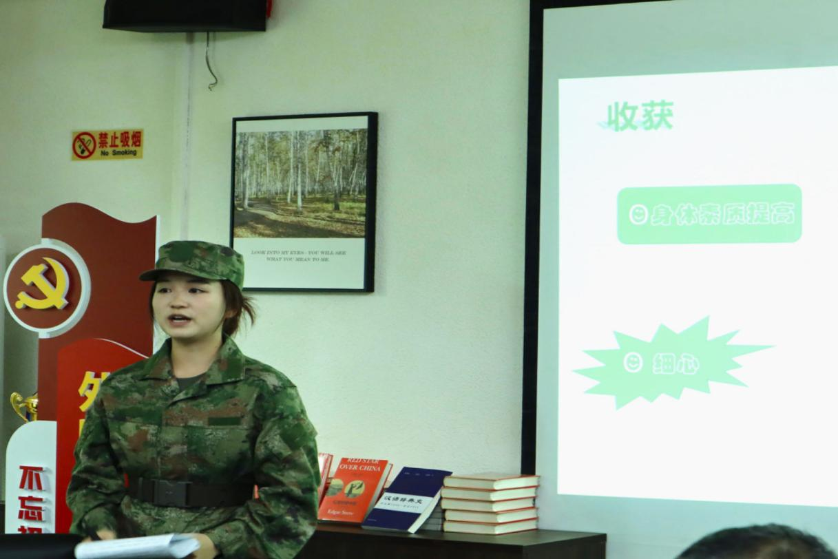 会计学院ACCA班2023级王佳同学的分享则让在场的同学们对北部战区的军旅生活有了更加深入的了解。他谈到了参军对于个人和家庭的光荣意义,以及在部队中经历的种种挑战与收获。他表示,参军不仅让他解锁了许多人生中的第一次,更让他深刻体会到了为人民服务的满足感。