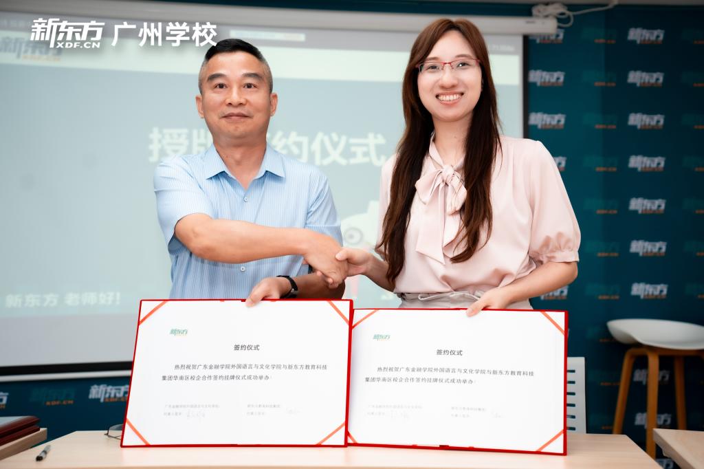 活动最后,双方围绕人才培养、校企合作模式进行了深入的交流,并在与会人员的共同见证下,黄庆雄与新东方教育科技集团华南区人力资源总监马艳红代表校企双方签署合作协议和授牌仪式。根据协议,双方将在共建实习实训就业基地开展合作。