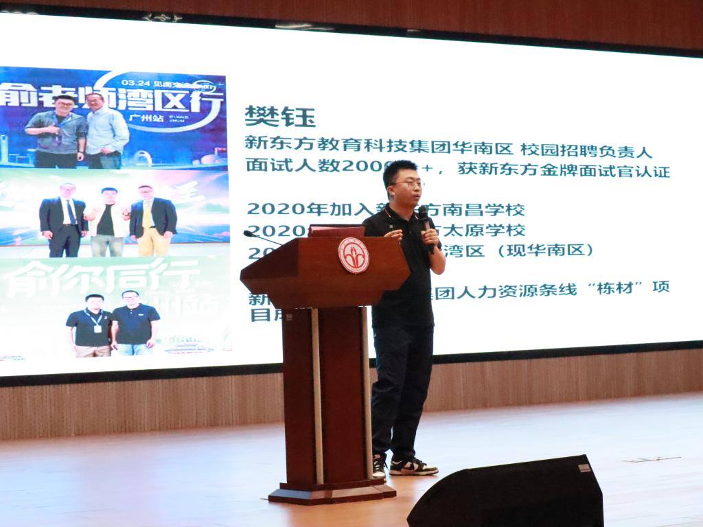 行业分享环节,新东方招聘主管樊钰结合多年招聘经验,从HR视角生动、详细地解析了优质简历的核心要素。现场特别设置了“简历雷区警示”环节,通过分析典型失败案例,提醒同学们避免出现信息不全、过度包装、模板滥用等常见问题。同学们积极参与互动,现场气氛活跃。2025届毕业生萧锦添从行业选择、职场适应、终身学习等角度分享了自己在新东方学习、成长的经历,号召学弟学妹“主动出击、敢于尝试”,以自信姿态迎接求职挑战。