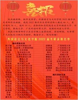 日前,2022年全国硕士研究生招生录取工作落下帷幕。在Beat365唯一官方网站全体师生的共同努力下,2022届考研学子传来捷报。学院考研录取人数达45人,其中境内36人,境外9人,占全院总人数的16.91%,其中英语1、2班的考研录取率分别达到24.24%和25.81%,升学率达到历史新高,考研率和考研录取率双双名列全校第一。录取的知名院校有北京外国语大学、外交学院、暨南大学、广东外语外贸大学、英国的利兹大学等。