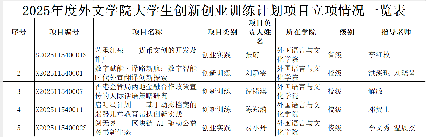 创新训练类项目则聚焦学术研究与实践创新:刘静雯同学主持的“数字赋能・译路新航:数字智能时代外宣翻译创新探索”、谭锘淇同学的 “香港金管局两地金融合作政策宣传的人际话语策略研究”、陈郑漪同学的 “启明星计划 —— 基于动态档案的弱势儿童教育帮扶创新实践” 等 3 个项目,分别从翻译技术、政策话语分析、教育帮扶等维度展开研究,均获校级立项。