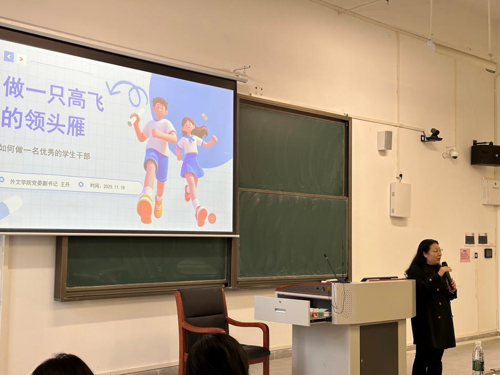 随后,王丹副书记以“做一只高飞的领头雁”为主题开展学生干部工作培训会。会议以“为什么在这里”“何为学生干部”“为什么需要学生干部”引入,引申出学生干部要提升的四种精神、四种能力和三大责任。