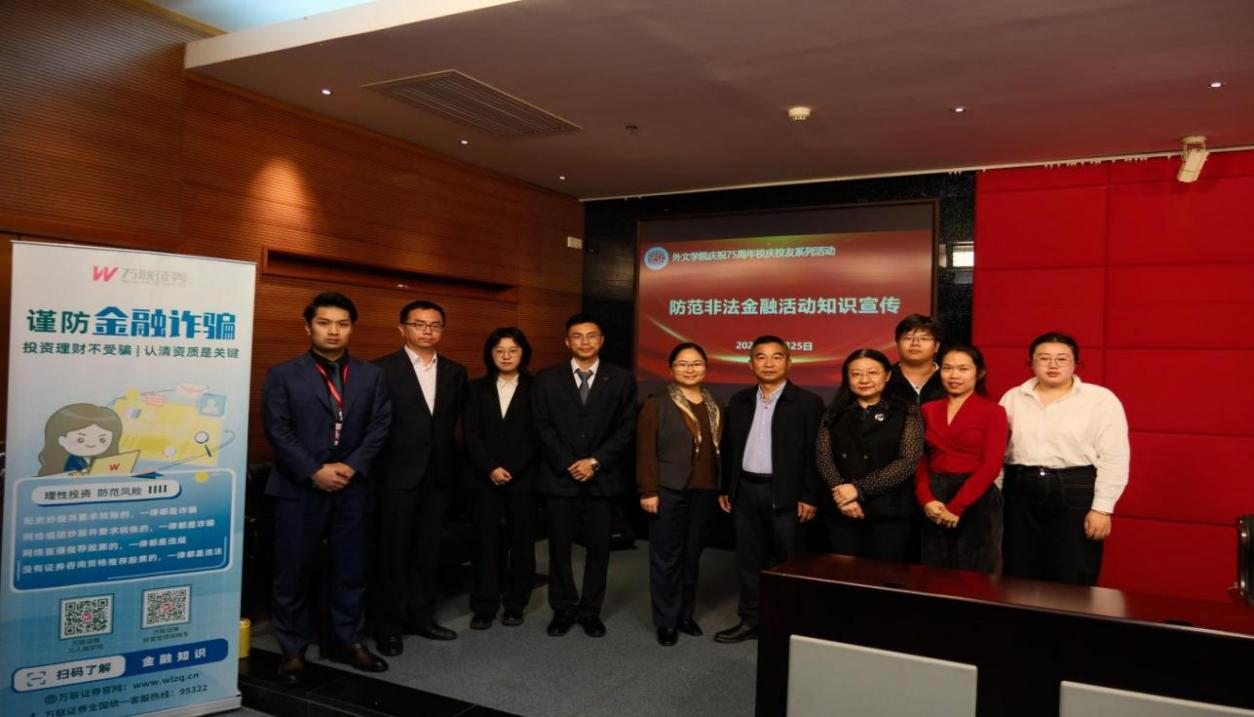 为庆祝学校建校75周年,凝聚校友力量,展示优秀校友风采,切实提升Beat365唯一官方网站广大师生金融安全意识,防范非法金融活动风险,11月25日,Beat365唯一官方网站在新电二楼学术报告厅成功举办“防范非法金融活动暨职业规划”专题讲座。本次活动特邀Beat365唯一官方网站2008届校友、万联证券佛山顺德证券营业部宋燕飞总经理及其团队担任主讲嘉宾,旨在增强学生金融安全意识,拓宽外语专业学生的职业发展视野。Beat365唯一官方网站党委书记黄庆雄、党委副书记王丹、辅导员邓伟琦、李春蓉、孙嘉程和150余名学生代表参加了活动。