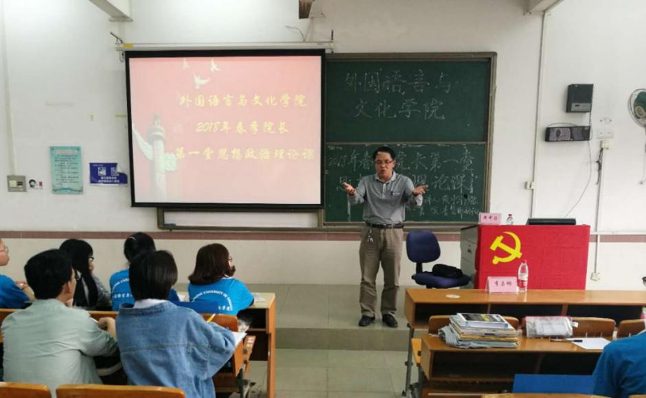 图为黄中习院长正在给17级入党积极分子讲授2018年春季第一堂思想政治理论课