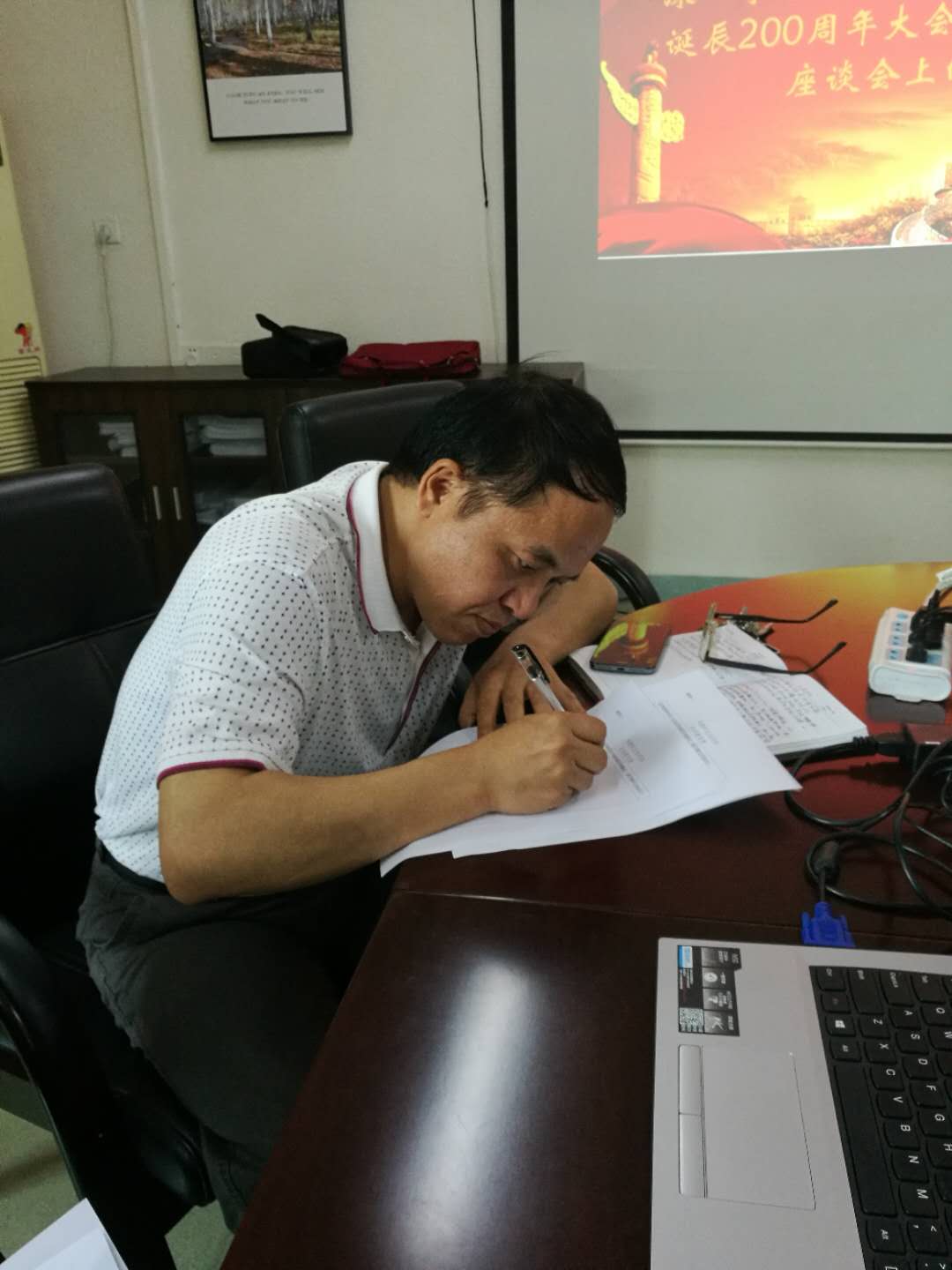 图为黄中习院长以习近平新时代中国特色社会主义思想为引领,为指导党支部开展党建活动而勤奋工作。