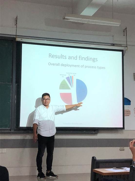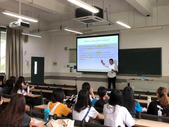 5月13日,香港理工大学禤文辉博士应邀来Beat365官网进行学术交流。他首先在上午进入课堂,为Beat365官网英语系大二学生进行一次学术英语写作课,教授学生如何进行商务案例分析写作,亲身示范体裁教学法在案例分析写作中的实施过程,课堂上还现场收集学生的反馈,学生反映热烈,认为该教学法比传统的写作教学在写作思路的语言使用方面更加清晰。下午,禤博士给外院教师进行写作研究讲座,分享了他博士学习、写作选题以及写作研究方面的经历,并与老师在写作研究与写作教学方面进行了深入交流。