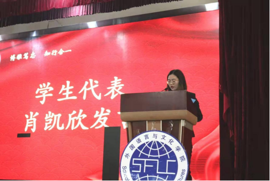 18级学生代表肖凯欣作为国家奖学金的获奖代表与同学们交流经验。肖凯欣同学提到“设立目标是成功的前提和基础”,表明订立目标,并坚定地跟随目标不断提升自我的重要性。同时,作为外语专业的学生,学习应注重日积月累,养成一个学习英语的良好习惯也尤为重要。此外,还要在各种各样的实践中提升自己,提升自身综合素养。最后,肖凯欣同学希望所有外文学子都不忘初心,怀揣梦想,积极进取,成就自我!