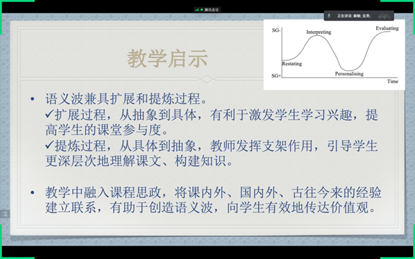 该报告内容为解老师近年来发表在国内外语言学核心杂志的研究成果。解老师以通俗易懂的方式,基于语义波理论,聚焦以文本为基础的英语教学,首先呈现了优秀教师课堂讲解所使用的话语策略。接下来,她将话语策略与课程思政相联系,力求探讨课程思政在话语层面的实现方式。她指出,在教学中融入课程思政,将课内外、国内外、古往今来的经验建立联系,有助于创造语义波,向学生有效地传达价值观。