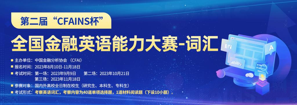 近日,由中国金融分析协会(CFAI)主办的第二届“CFAINS杯”全国金融英语能力大赛-词汇大赛圆满落幕。党的二十大报告指出,必须坚持社会主义市场经济改革方向,坚持高水平对外开放,加快构建以国内大循环为主体、国内国际双循环相互促进的新发展格局。为进一步增强全国大学生金融英语专业知识和专业技能,“中国金融分析协会”面向全国高校大学生举办“第二届‘CFAINS杯’全国金融英语能力大赛”,旨在发现和培养更多英语能力卓越的人才。