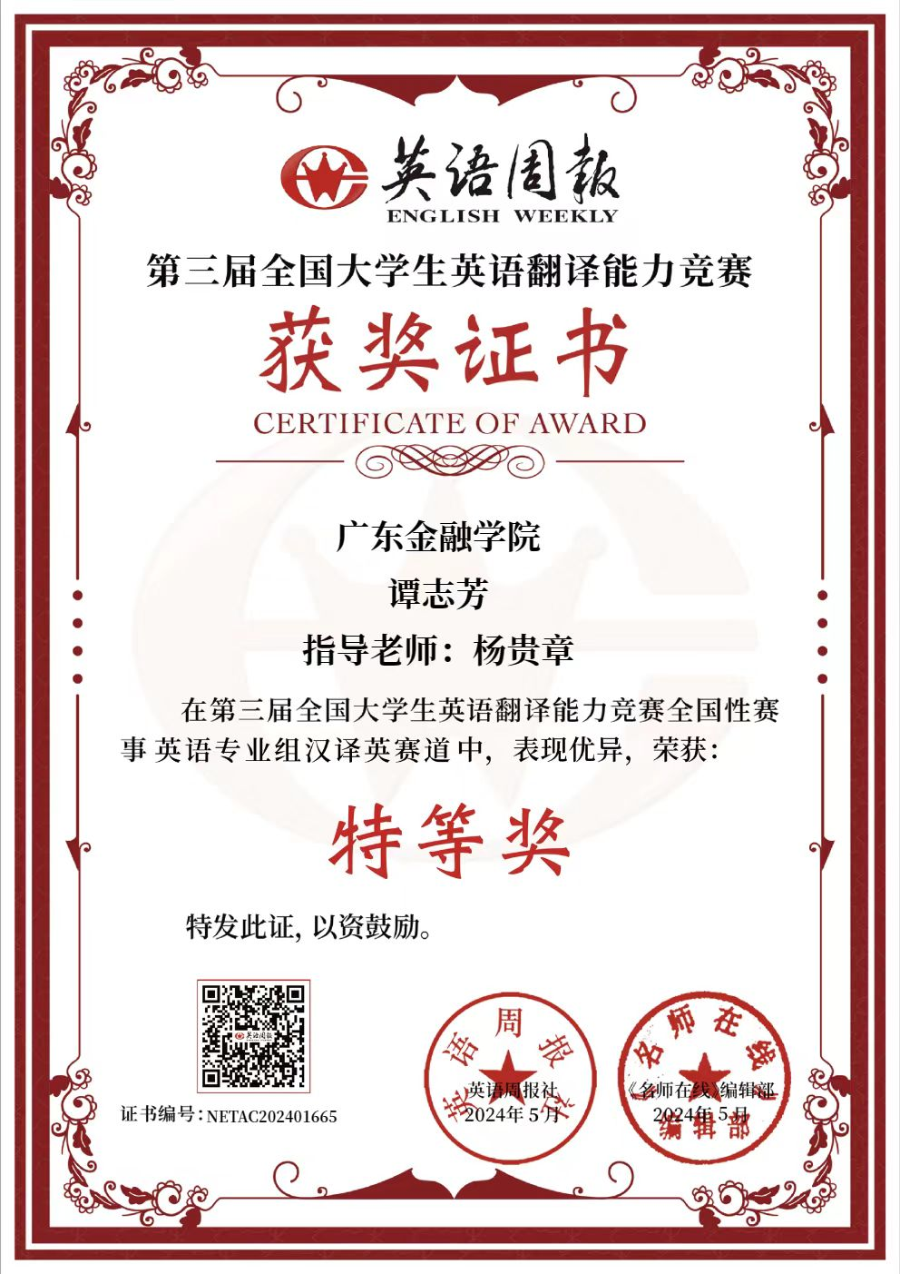 第三届全国大学生英语翻译能力竞赛已落下帷幕,竞赛吸引数十万余全国学子集聚参赛。经激烈角逐,Beat365唯一官方网站谭志芳同学(学号221598119)以其卓越的英汉互译能力,暂获英语专业组汉译英赛道特等奖(第三名)和英译汉赛道二等奖,喜获特等奖奖金二百元,为Beat365唯一官方网站增添了光彩。