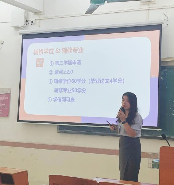 毕亚男主任向英语专业新生讲课,她首先引用了北京外国语大学孙有中教授的话,强调了外语不仅是交流的工具,更是文学、文化和思想的载体。高等教育针对新时期新文科建设的新要求,应及时调整教育教学理念,服务于学生发展需求。在此背景下基于OBE理念的英语专业24级新人培方案的落地,强调以学生发展为中心,顺应时代发展和学校发展的需要, 构建起科学的人才培养路径。毕老师详细介绍了英语专业的人培方案具体内容,包括培养目标、规格要求、学制学分、课程设置等,以及新人培的重要变化,为24级新生了解专业课程规划,未来学业生涯发展、职业规划确立了明确的目标和发展方向。此外,毕亚男老师还介绍了英语专业的培养质量和培养特色、专业考试、学科竞赛活动、专业实习、实践机会,以及毕业生的就业和升学情况。毕亚男老师鼓励新生积极参与第二课堂活动,以全面提升自己的专业能力和人文素养。本次大会以21级英语专业梅颖姿师姐的个人发展阶段性总结视频结尾,以榜样的力量激励新生勇敢追求自己的梦想,为未来的职业生涯打下坚实的基础。