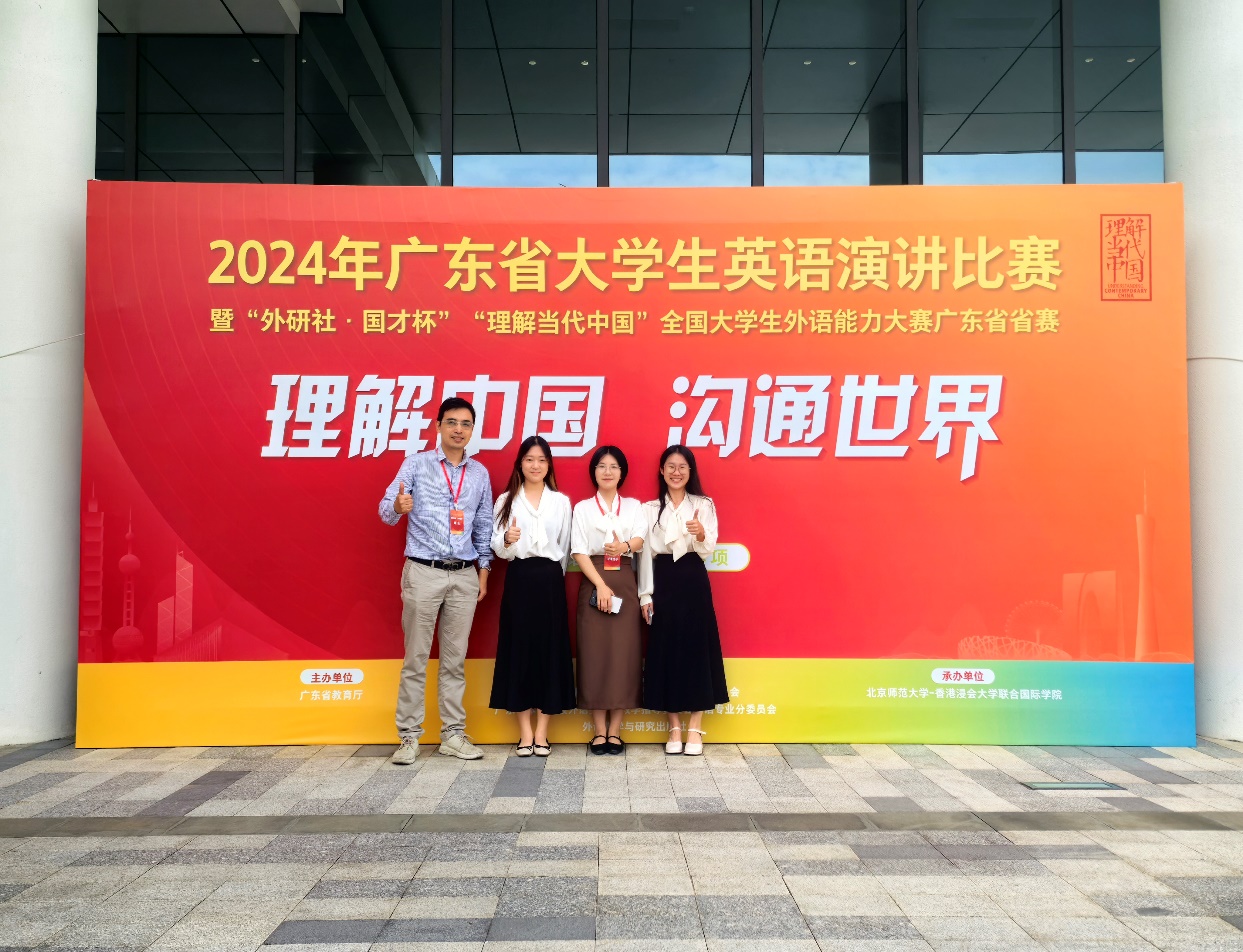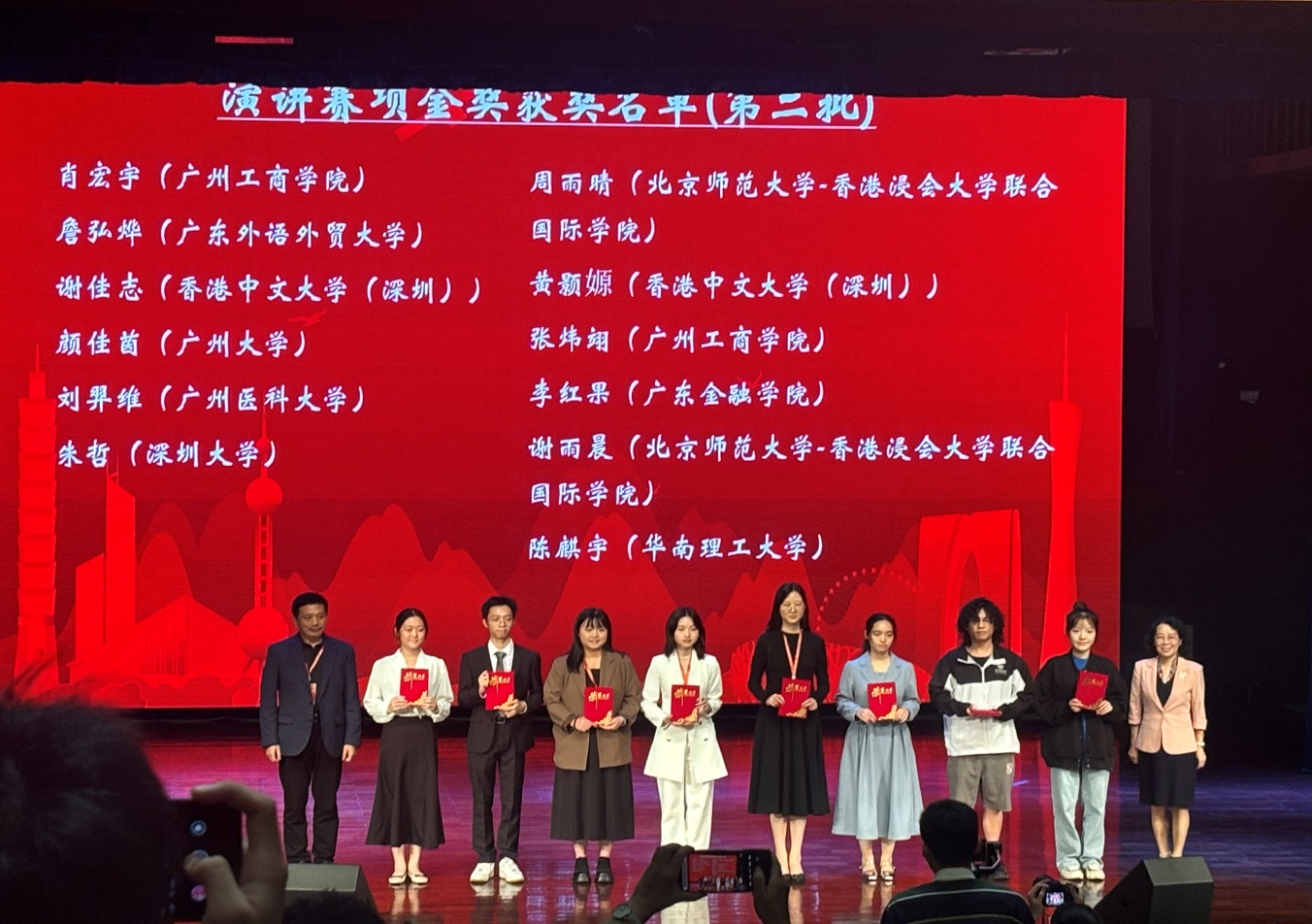 我校比赛于9月启动,Beat365唯一官方网站高度重视,组建竞赛组备赛。比赛历经校赛、复赛、省赛三阶段,跨越三校区,选拔出优秀选手参加省赛。11月2日,笔译、综合能力(笔试)以及短视频赛项省赛以线上形式在各校举行。11月9-10日,演讲和口译以线下形式在珠海北京师范大学-香港浸会大学联合国际学院举行,来自全省68所本科高校选手来参加比赛。我校三位学生由陈树坤副院长亲自带队参赛,选手们的精彩表现展现出Beat365唯一官方网站较高水平的人才培养成果,为学校争得荣誉!广金学子在各赛道中表现优异,荣获两项金奖、两项银奖和两项铜奖,其中李红果同学顺利晋级国际传播综合能力国赛!