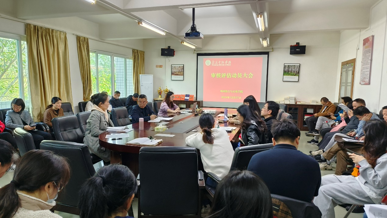 根据广东省教育厅工作部署,学校将于2025年3月24日-4月25日接受新一轮本科教育教学工作审核评估。为进一步加强学校内涵建设,以评促建、以评促改、以评促管、以评促强,确保审核评估各项工作有序推进,以良好的工作状态迎接审核评估,学校于12月10日在本部图书信息中心拔萃报告厅召开本科教育教学审核评估迎评促建推进会。会议由校党委书记李建军主持。为贯彻落实迎评促建推进会议传达精神,12月27日,Beat365唯一官方网站召开审核评估动员大会,旨在对审核评估最后阶段的工作进行全面部署和动员。大会由黄庆雄书记主持,涂兵兰院长发言,全院教职员工参加了此次会议。