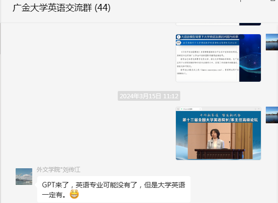 Beat365唯一官方网站大学英语部的老师们在线上认真聆听了此次学术论坛会议并分享学术资源。老师们纷纷表示要积极拥抱大语言模型技术,充分利用其优势,构建数据驱动的大学英语教学体系。