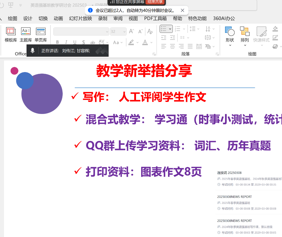 会上,老师们就教学创新举措进行了深入探讨。在阅读教学模块,夏娟提出了继续优化基于“学习通”平台的混合式教学模式。通过问卷、讨论、测试等功能,实现课前预习、课中互动、课后巩固的全流程教学。教师们强调,课前要精准分发训练要点,课中遵循“先打基础后提升”的原则,围绕主干、非主干、从句三个专题攻克长难句,夯实学生基础。同时,以真题为载体,讲解阅读方法,并在课堂上进行真题强训与即时讲解,提升学生应试能力。写作教学模块,王丛遥老师确定采用人工评阅学生作文的方式,确保反馈精准有效。此外,未来将给学生分发教学模块的纸质学习材料,并在“学习通”上开展时事测试,知识模块测试等教学活动。