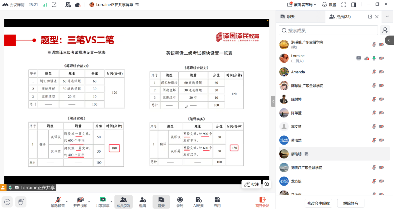 领导致辞之后,培训班主讲教师Lorraine对参班学员作CATTI备考规划指导,在CATTI考纲要求解读和往年真题来源分析基础上,通过典型案例讲解破题思路,展示翻译技巧的灵活应用。整场讲座下来,同学们表示受益匪浅,不仅厘清了备考方向,更在鲜活案例中深切体会到“以技巧驭万变”的翻译魅力,信心倍增地踏上CATTI冲刺之路。