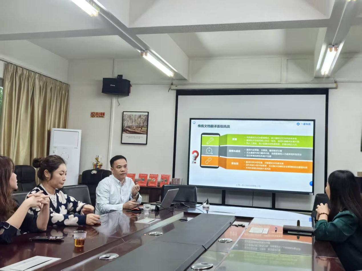 讲座中,刘鹏总监分享了翻译行业普遍使用的计算机辅助翻译(CAT)技术、机器翻译(MT)技术、大语言模型(LLM)技术和语料库加工等技术,演示了相关技术在YiCAT翻译管理平台的融合应用与操作,并介绍了软件本地化项目管理的基本操作流程。